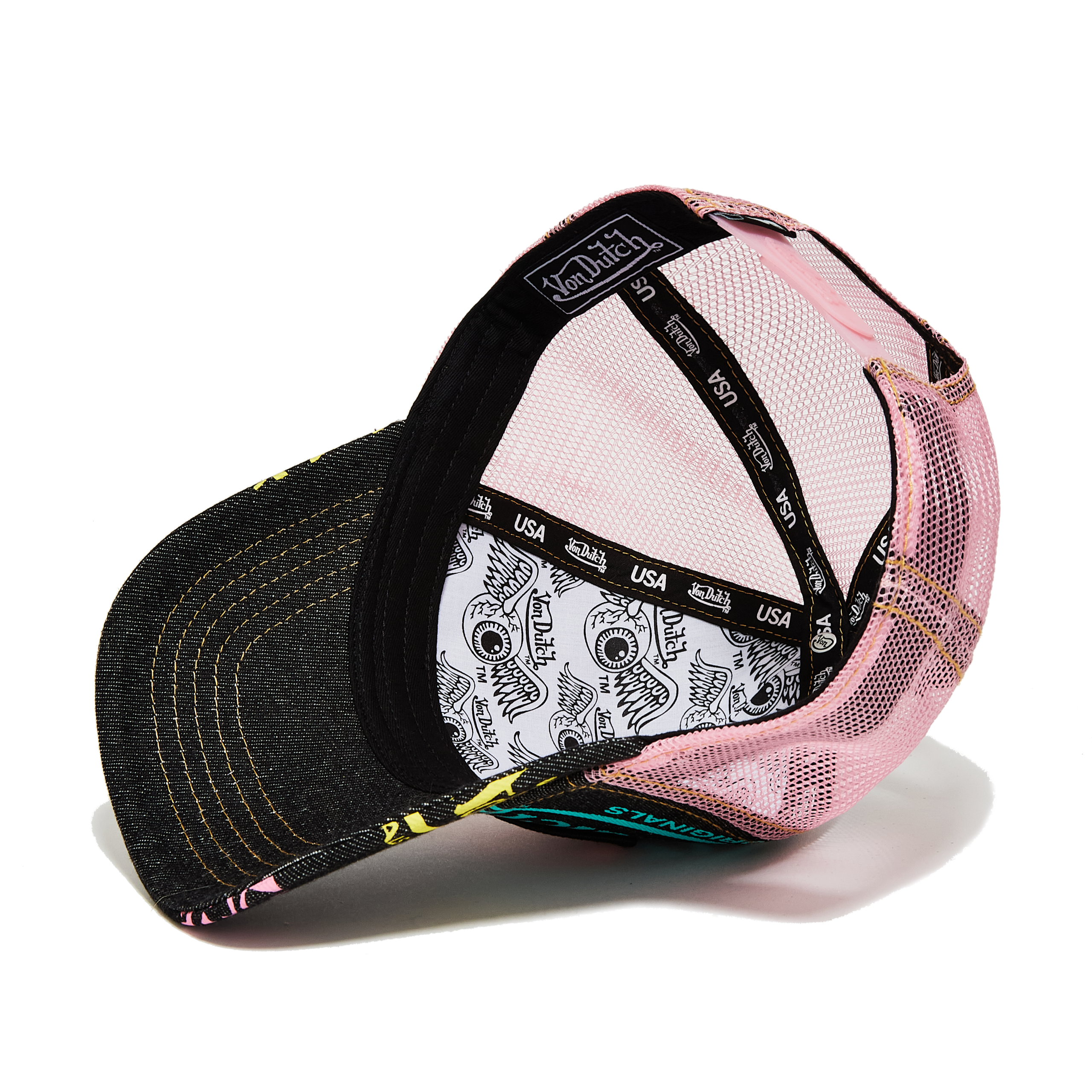 This Classic Dark Denim Snapback Trucker by Von Dutch features the multi color All-Over print Logo print with iconic logo patch on front and a pink breathable mesh rear.