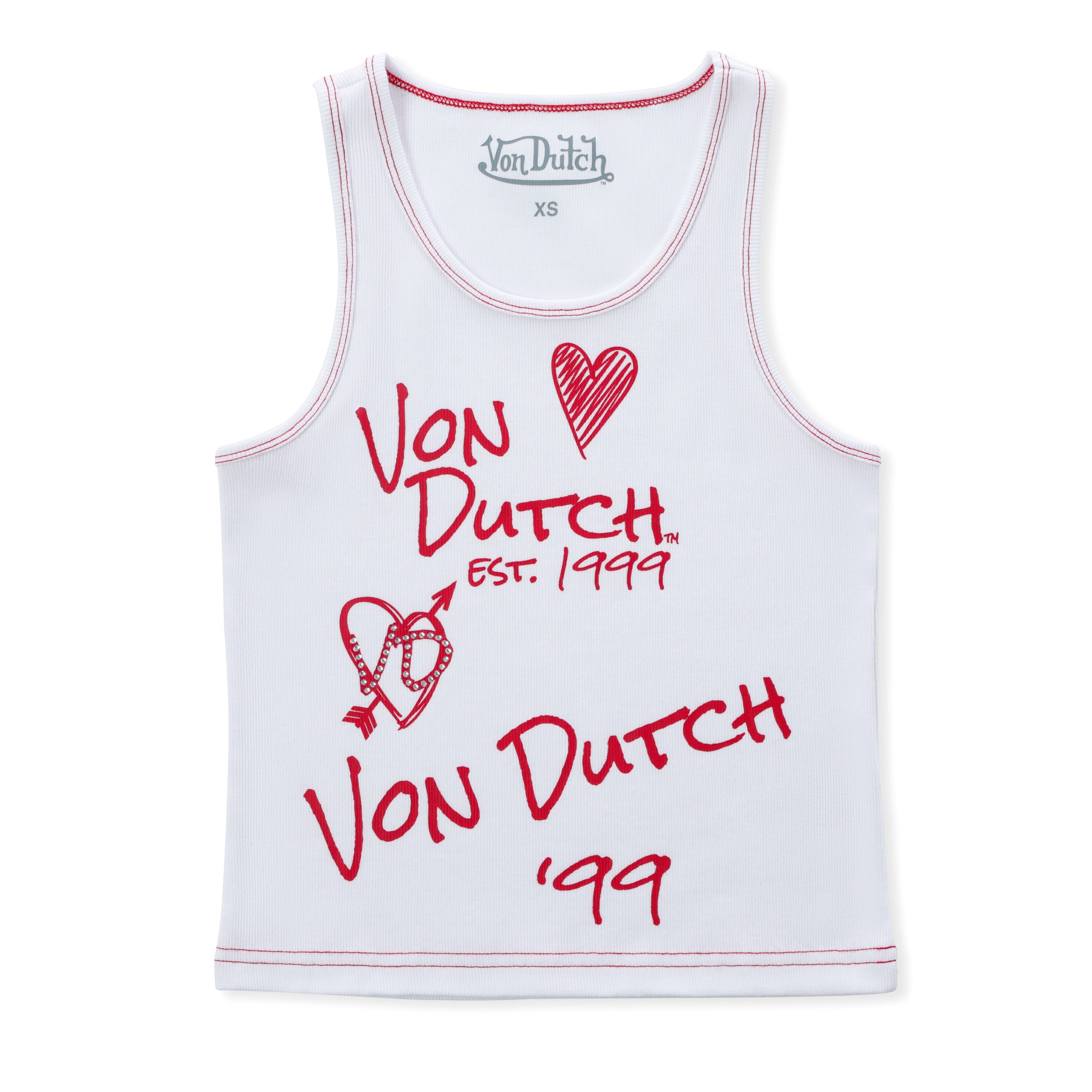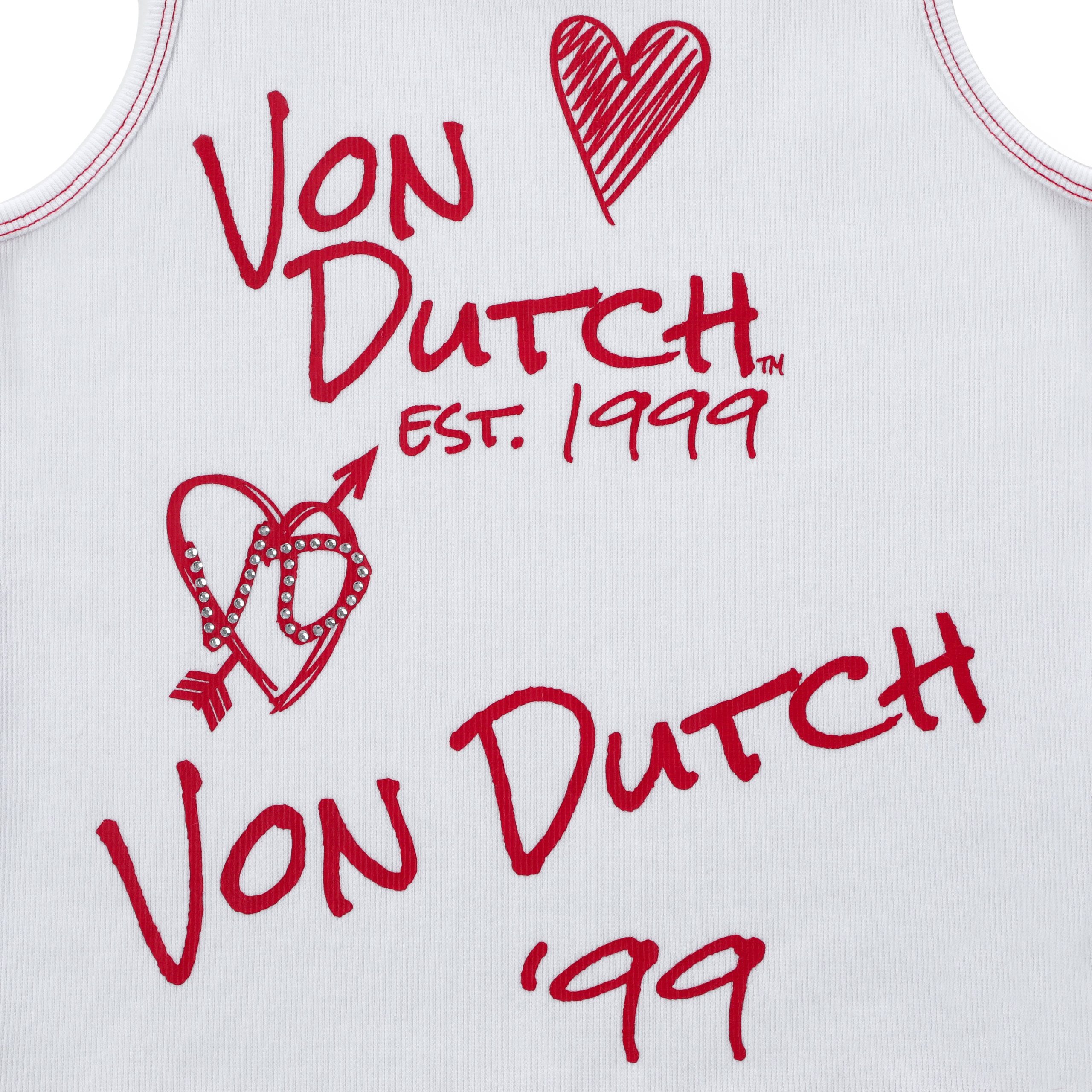 | Color | Doodle Tank – White, "I Love Von Dutch" Rhinestone Tank – Blue, Rhinestone Cherry Tank – Blue, Rhinestone Warped logo Tank – Brown, Rhinestone Cursive logo Tank – Red, 99' Rhinestone Tank – White, "I Love Von Dutch" Rhinestone Tank – Pink, "I Love Von Dutch" Rhinestone Tank – Gray, "I Love Von Dutch" Rhinestone Tank – Maroon, "I Love Von Dutch" Rhinestone Tank – Neon Green, Doodle Tank – Black, 99' Rhinestone Tank – Pink, Accent Rhinestone Tank, Doodle Tank – Pink, Rhinestone Cherry Tank – Black, Rhinestone Cursive logo Tank – Brown, Rhinestone Warped logo Tank – Blue, Rhinestone Warped logo Tank – Green, Rhinestone Warped logo Tank – Hot Pink |