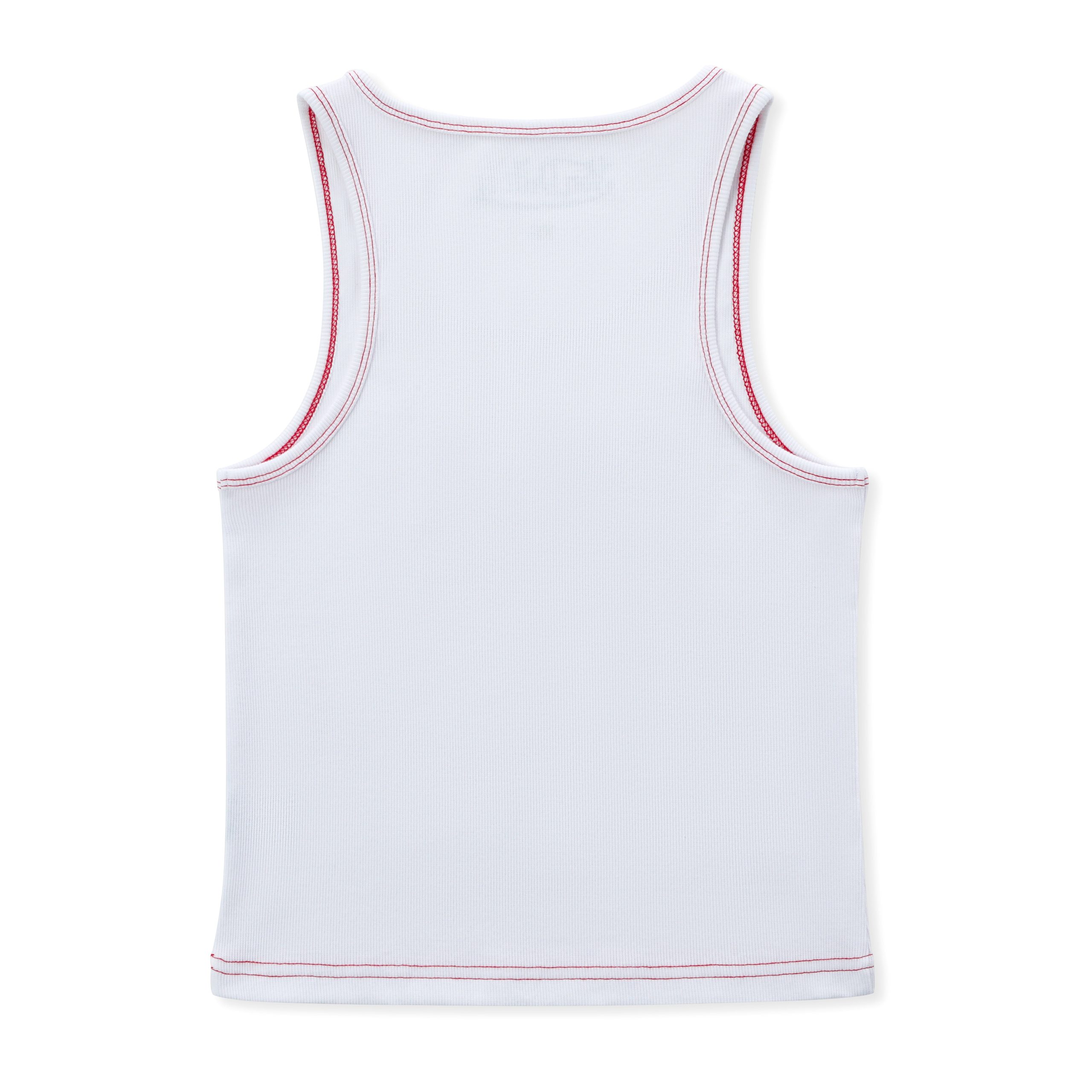 Red contrast stitching on neck, armholes, and hem