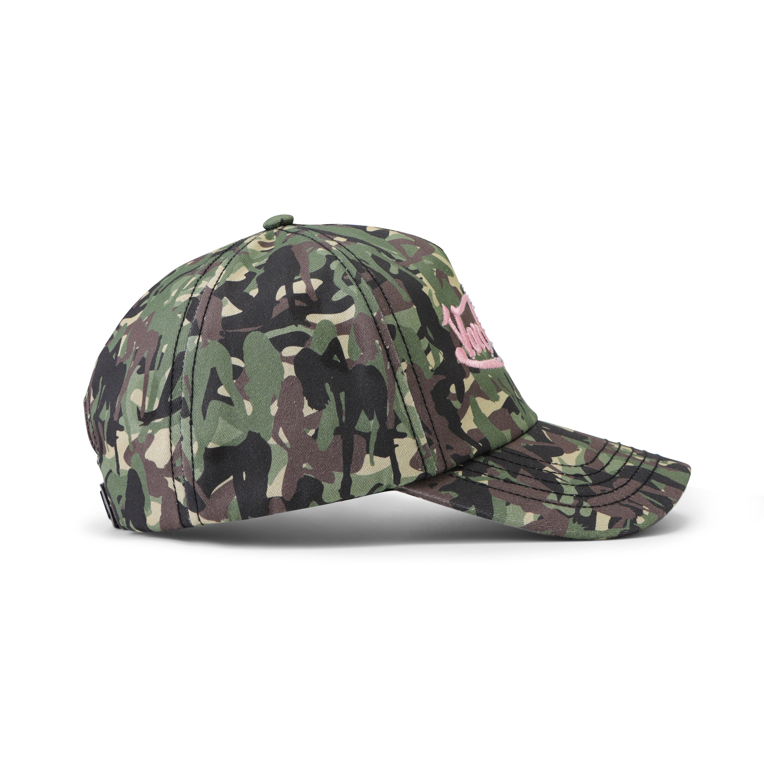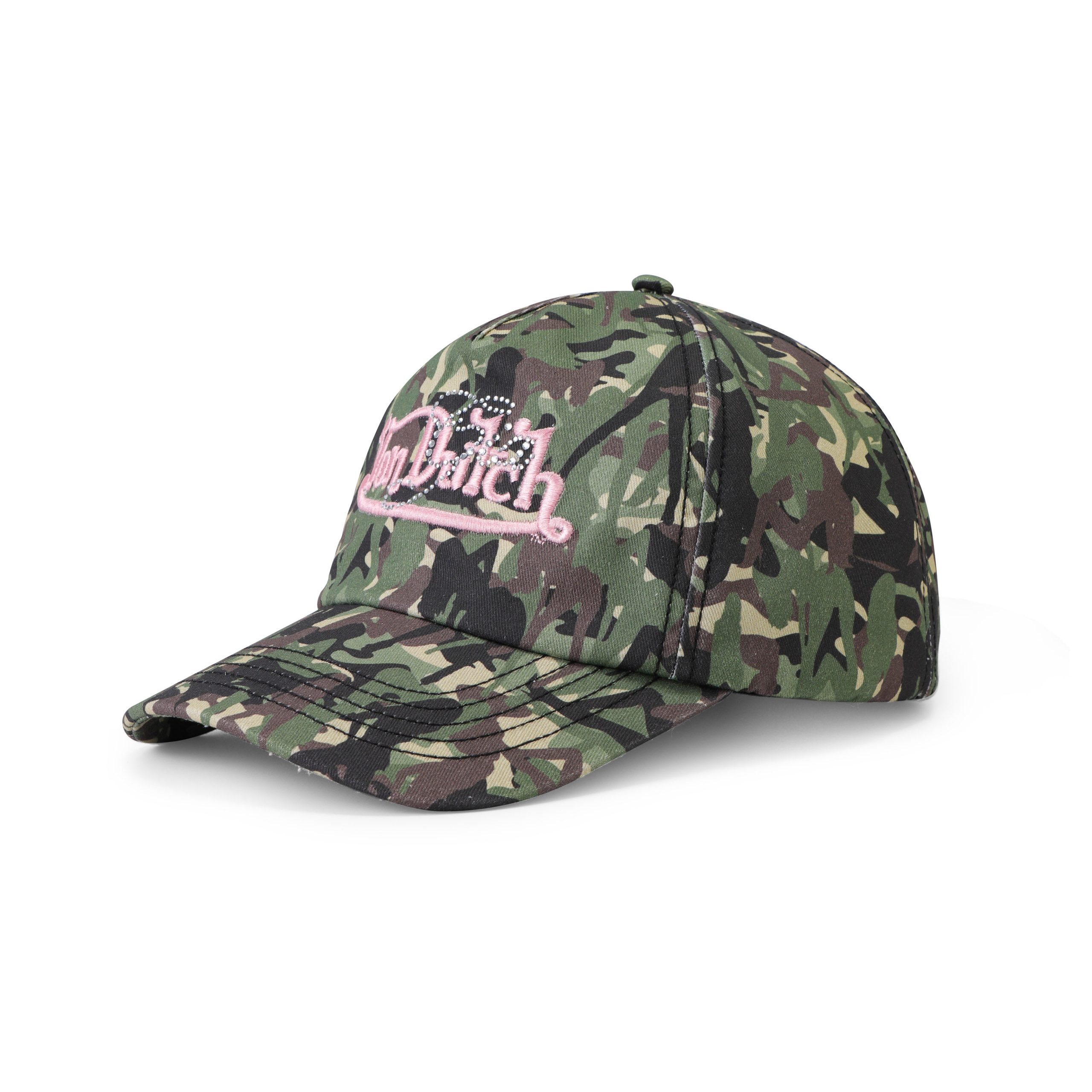 All over stripper camo print with an embroidered pink Von Dutch logo on front layered with a diamant?? ‘GIA’ logo