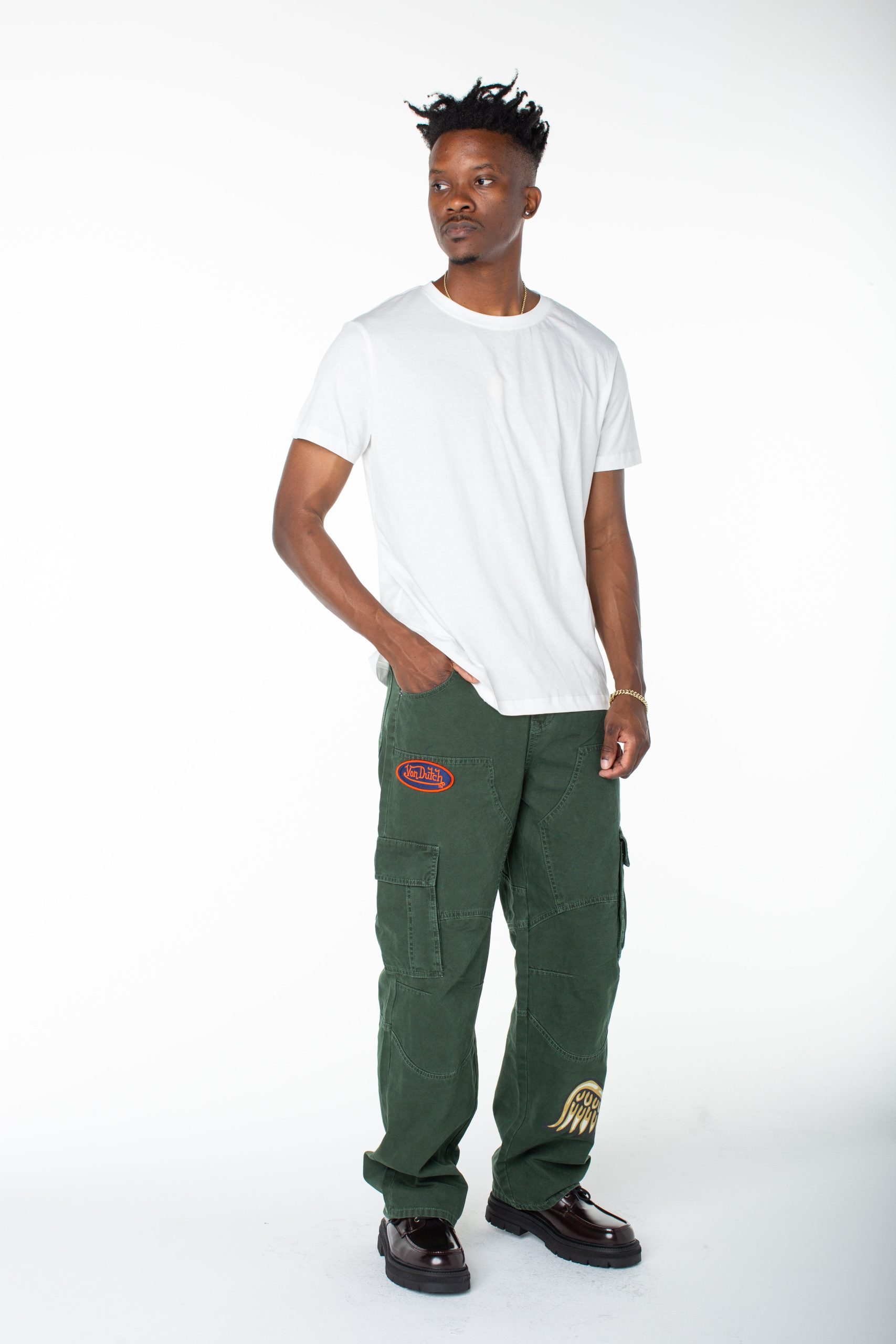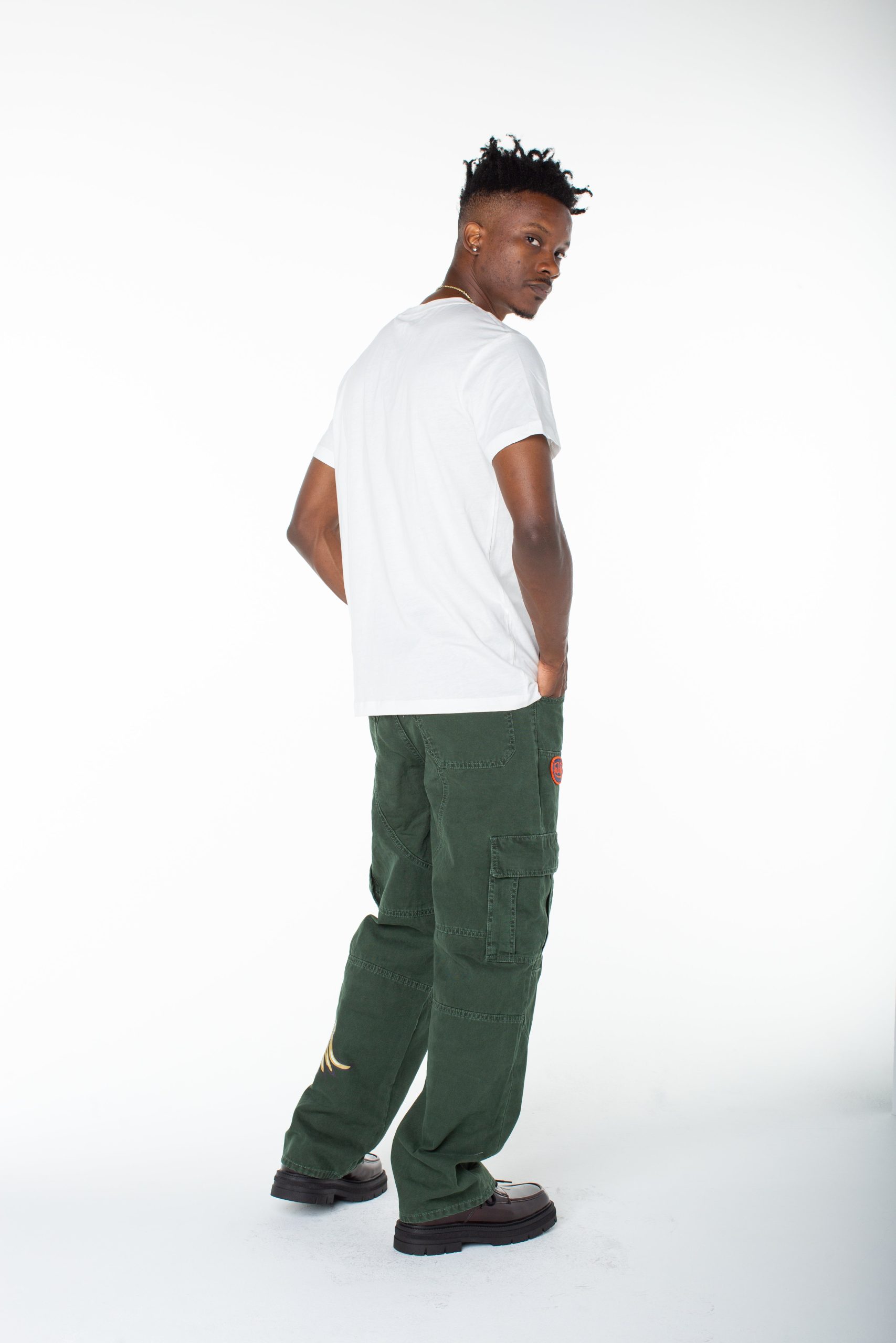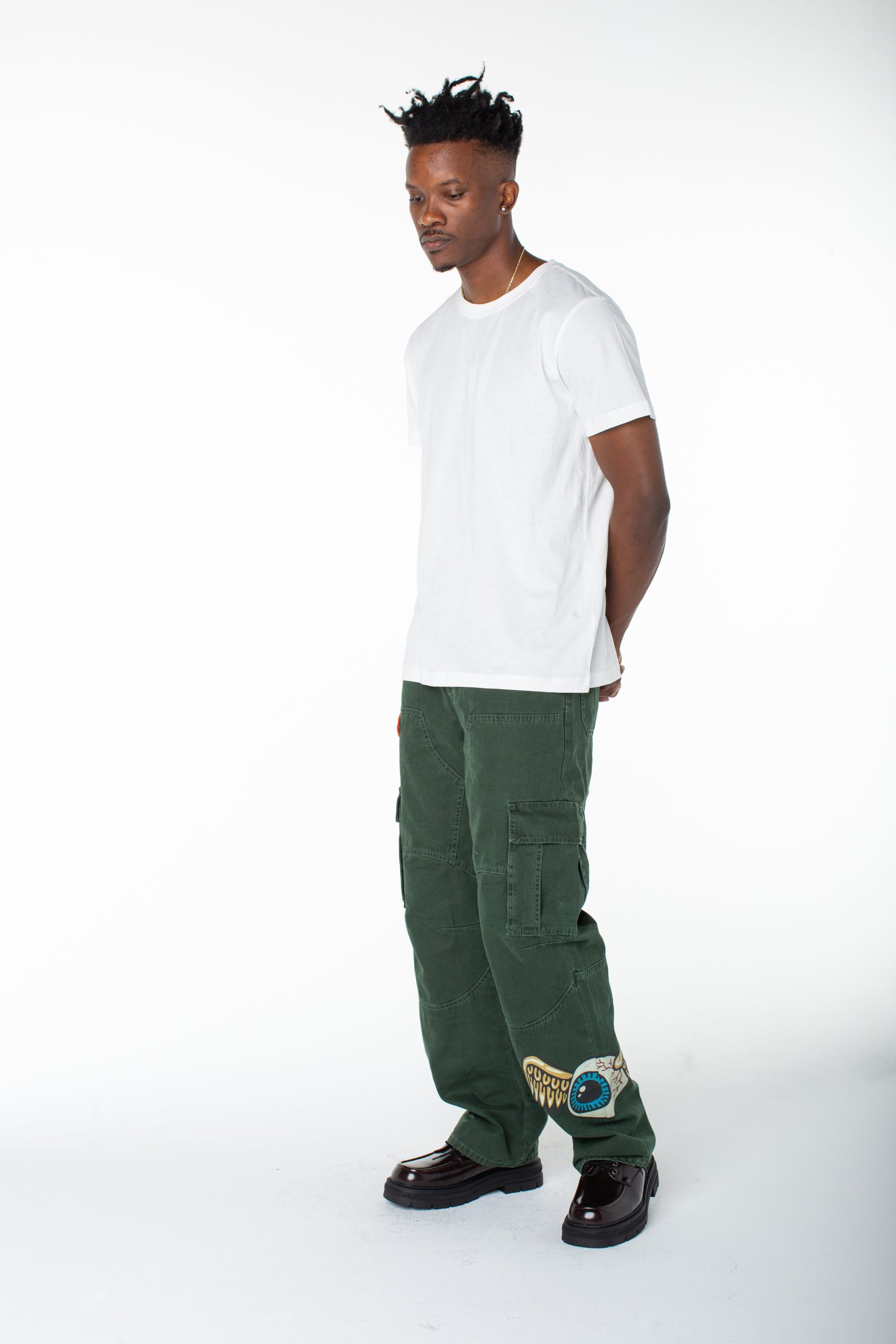 Serve streetwear casual in a baggy cargo that features a bold contrasting graphic and an upper right side patch. Match this with the coordinating zip up “invaders hoodie”