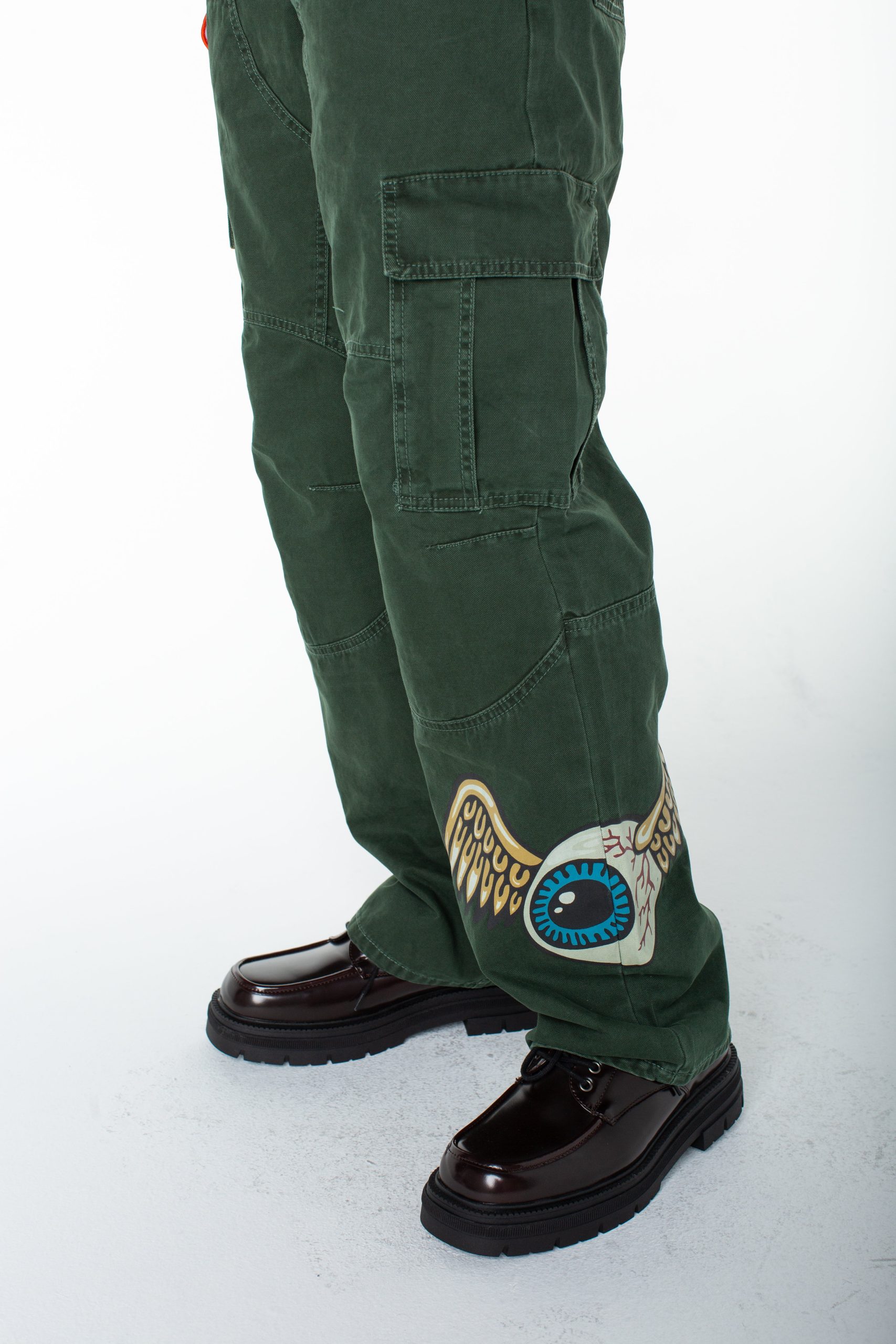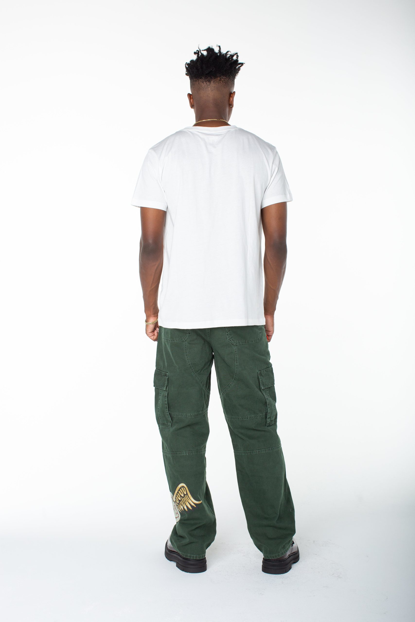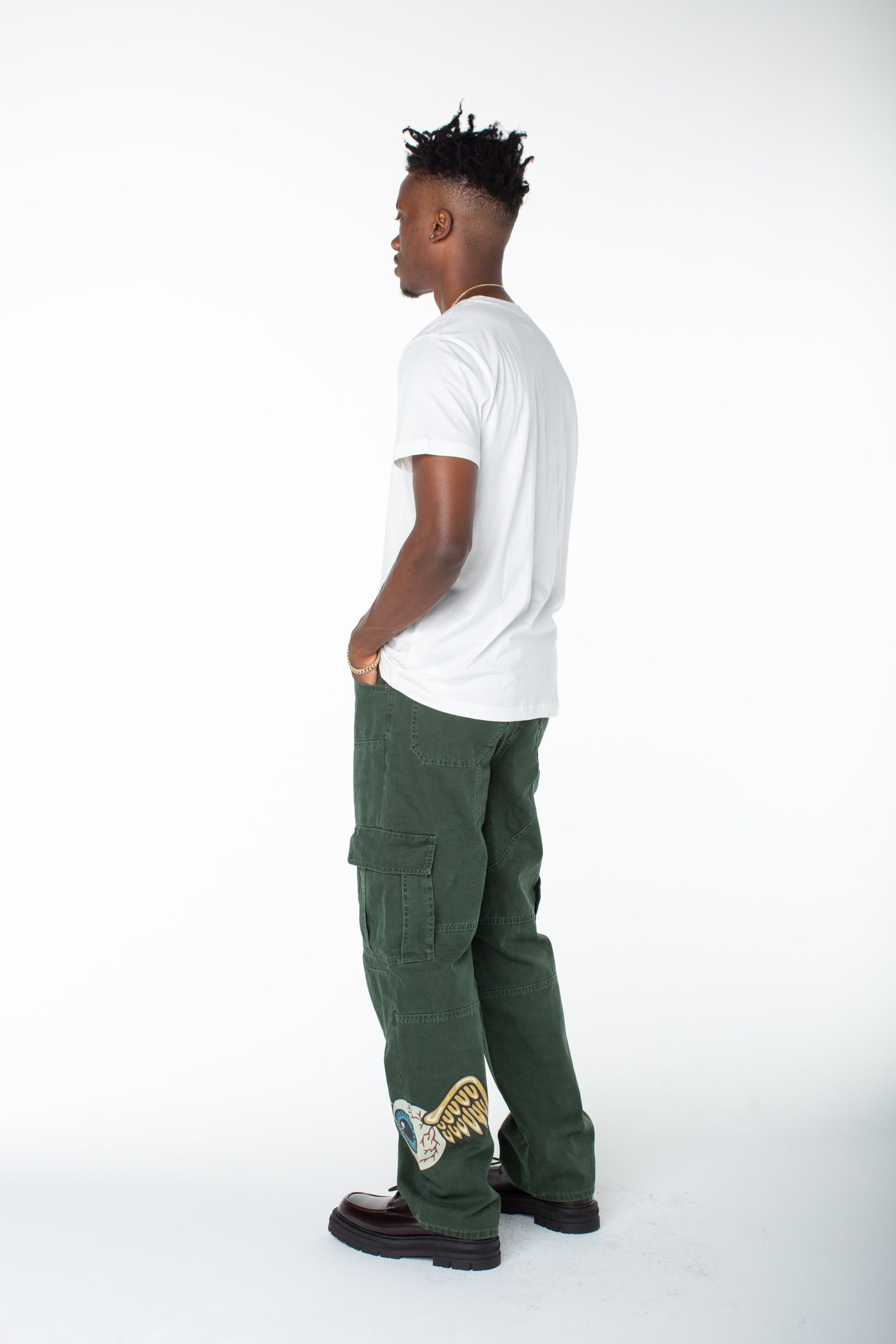Serve streetwear casual in a baggy cargo that features a bold contrasting graphic and an upper right side patch. Match this with the coordinating zip up “invaders hoodie”