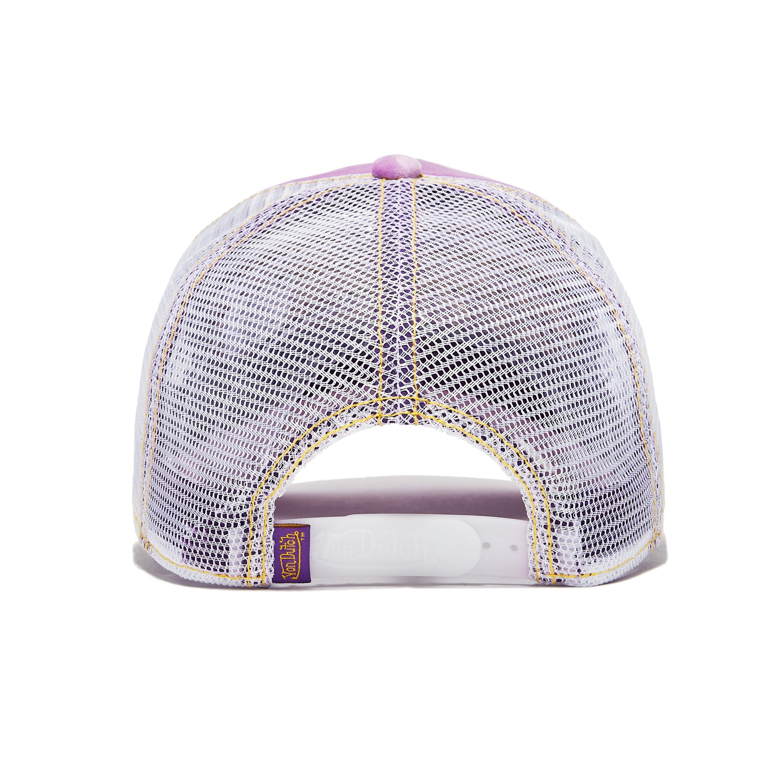 This Classic Snapback Trucker Hat by Von Dutch features Purple Velvet cloth with iconic logo upside down patch on front, white breathable mesh rear, and an adjustable snapback panel. All headwear sales are final.?