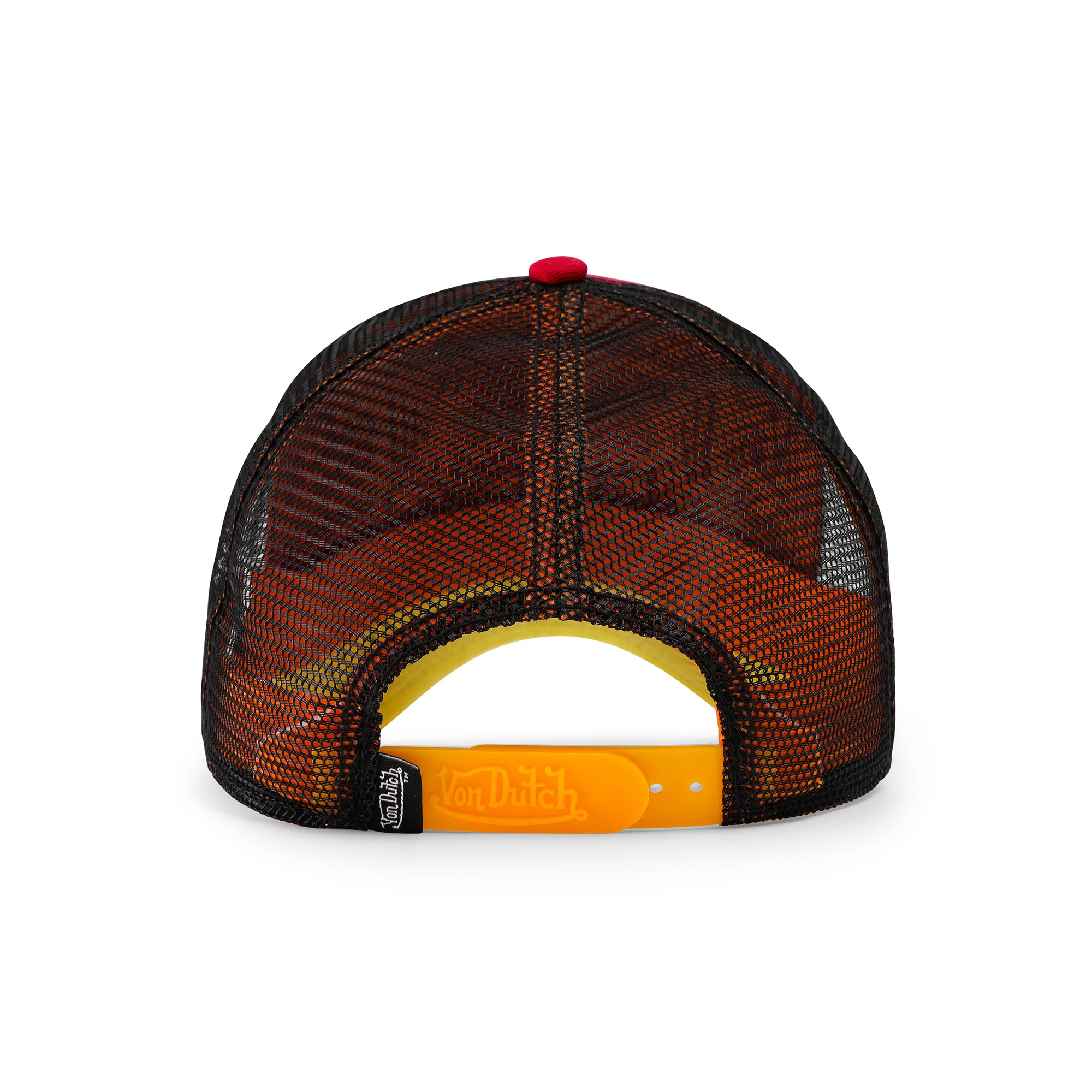 Hot Von Dutch City of Angels Trucker. This Classic snapback trucker hat with flame graphic pattern in red and yellow pearl and embroidered yellow Von Dutch logo on front, black breathable mesh rear, and an adjustable snapback panel. All headwear sales are final.?