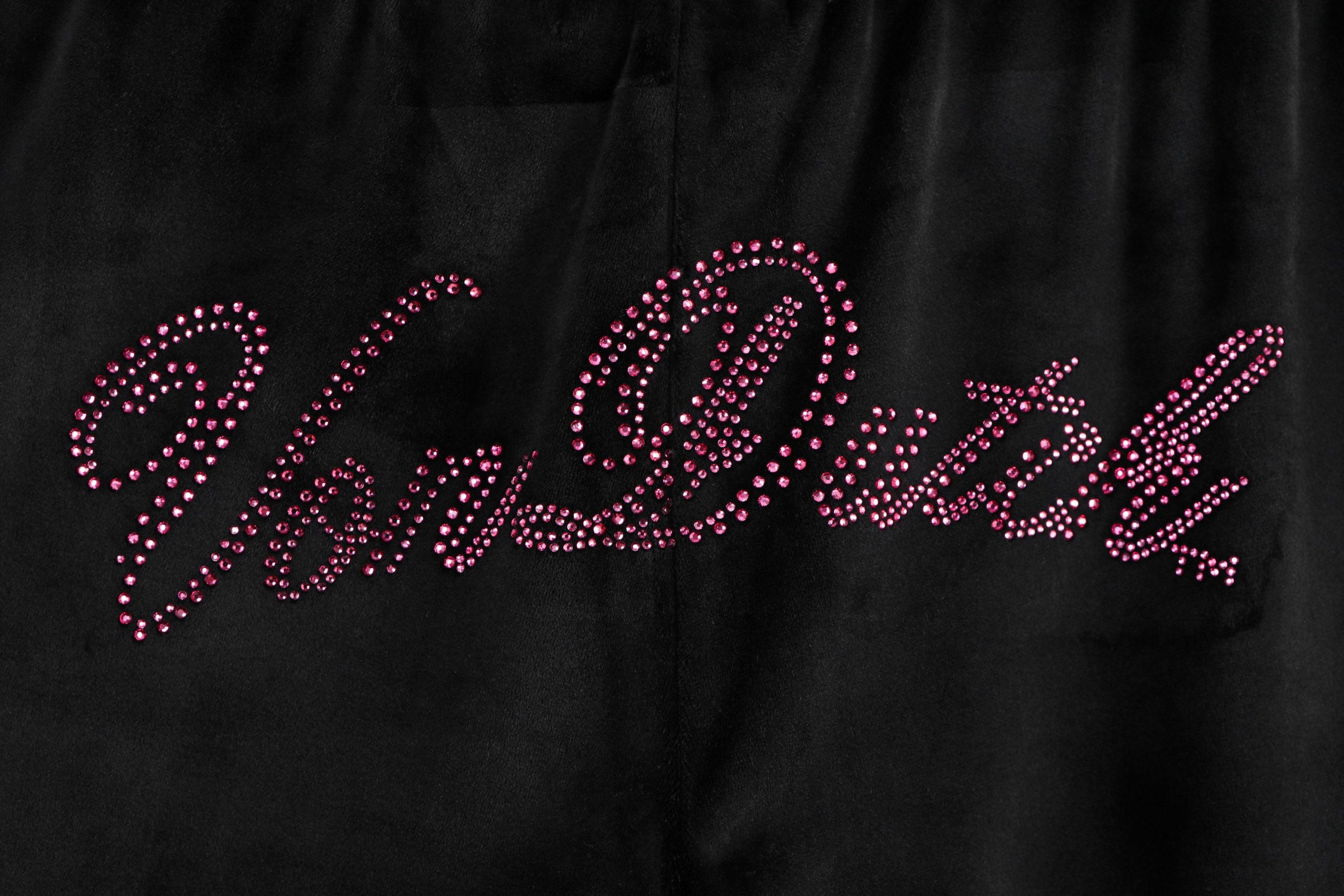 A soft velour sweat pants finished with a full rhinestone Von Dutch logo on the back.