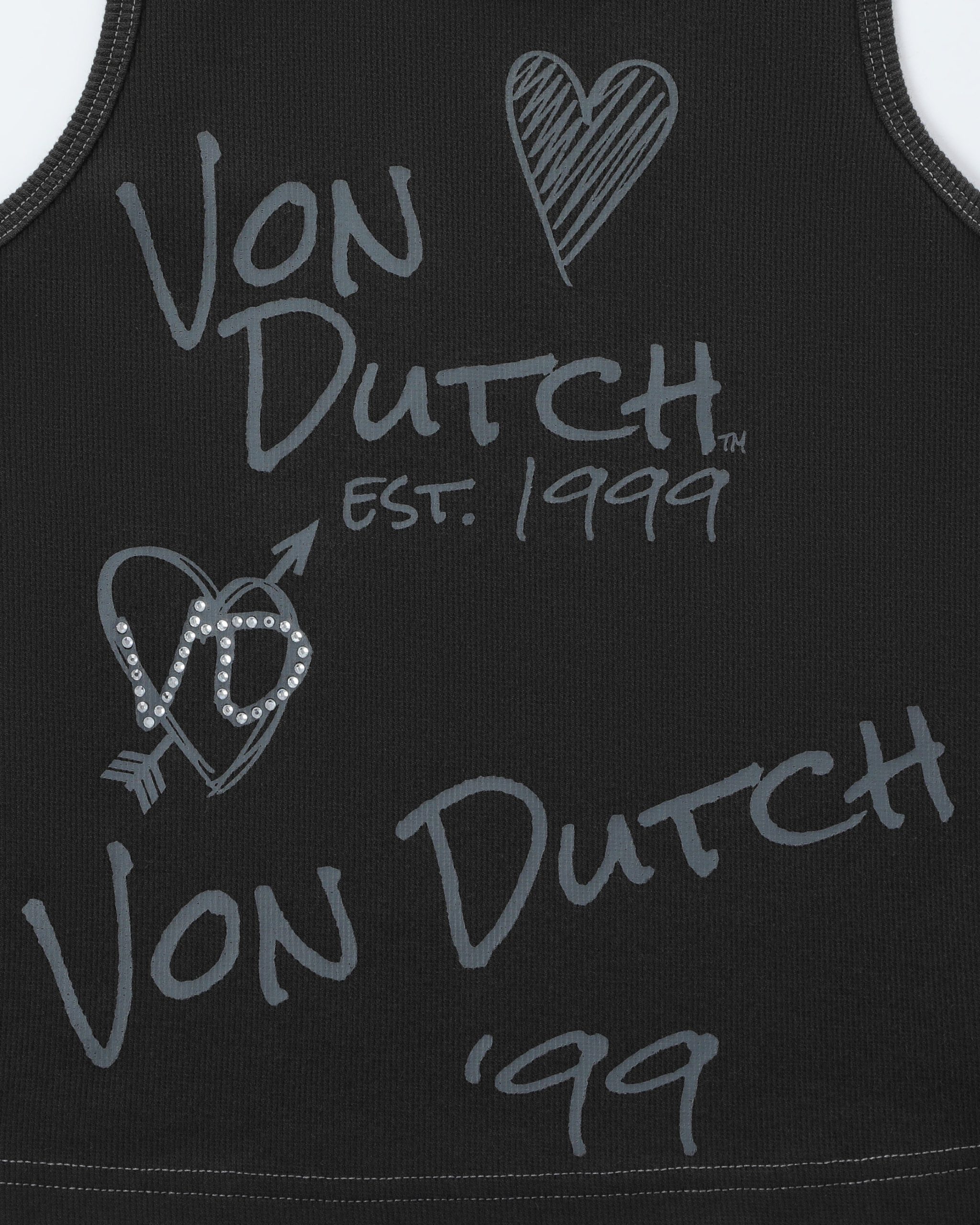 | Color | Doodle Tank – Black, "I Love Von Dutch" Rhinestone Tank – Blue, Doodle Tank – White, Rhinestone Cherry Tank – Blue, Rhinestone Warped logo Tank – Brown, Rhinestone Cursive logo Tank – Red, 99' Rhinestone Tank – White, "I Love Von Dutch" Rhinestone Tank – Pink, "I Love Von Dutch" Rhinestone Tank – Gray, "I Love Von Dutch" Rhinestone Tank – Maroon, "I Love Von Dutch" Rhinestone Tank – Neon Green, 99' Rhinestone Tank – Pink, Accent Rhinestone Tank, Doodle Tank – Pink, Rhinestone Cherry Tank – Black, Rhinestone Cursive logo Tank – Brown, Rhinestone Warped logo Tank – Blue, Rhinestone Warped logo Tank – Green, Rhinestone Warped logo Tank – Hot Pink |