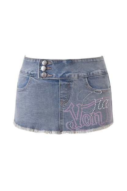 Denim mini skort in a classic light blue wash designed in collaboration with Von Dutch