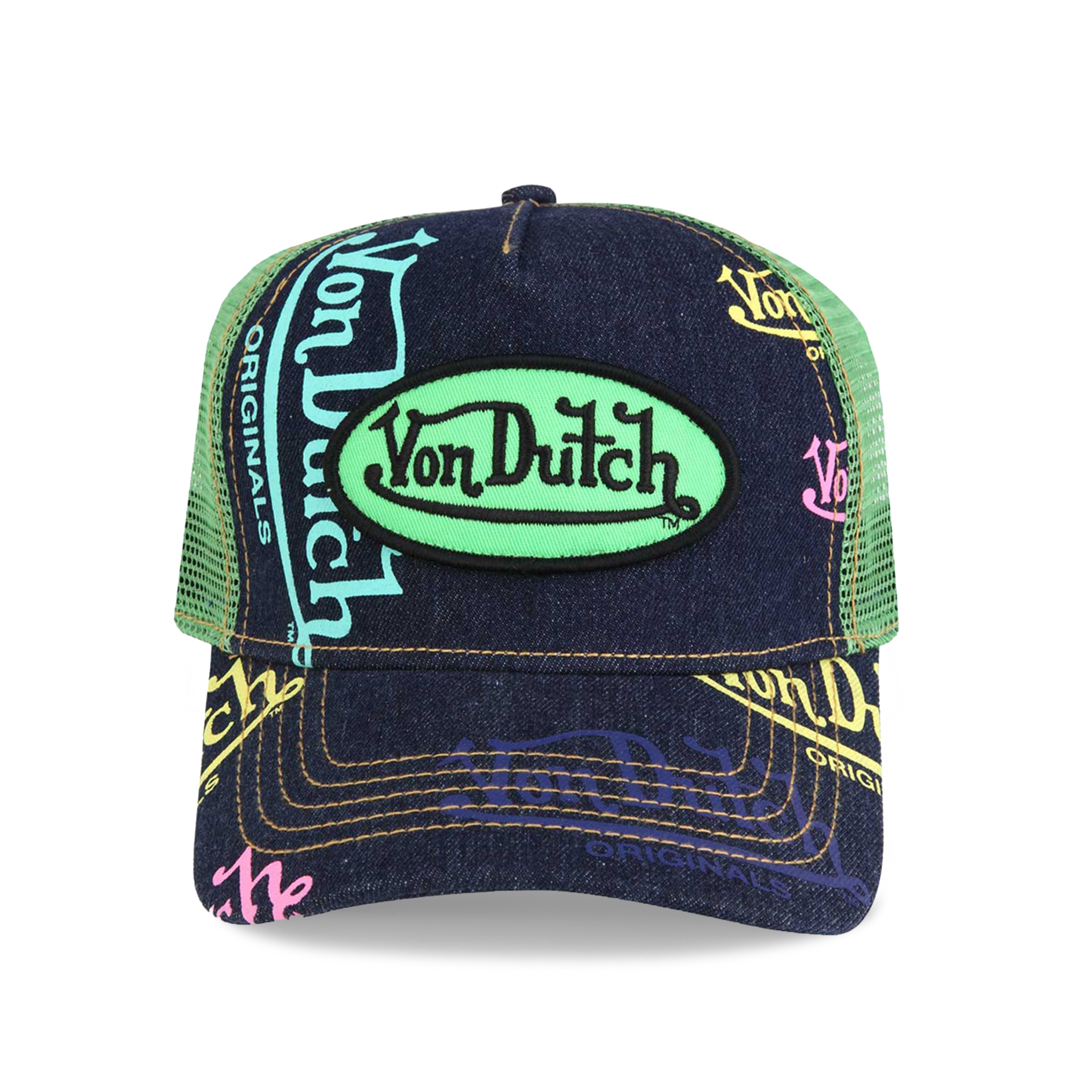 This Classic Snapback Trucker Hat by Von Dutch features Denim Logo print with iconic logo patch on front, a Green Apple breathable mesh rear, and an adjustable snapback panel. All headwear sales are final.?