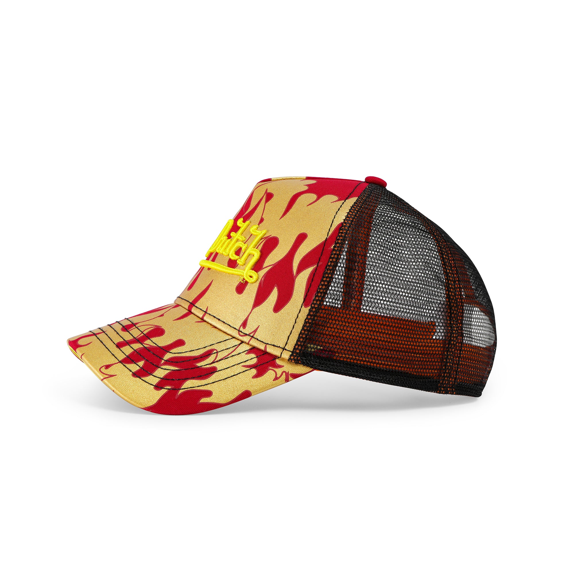 Hot Von Dutch City of Angels Trucker. This Classic snapback trucker hat with flame graphic pattern in red and yellow pearl and embroidered yellow Von Dutch logo on front, black breathable mesh rear, and an adjustable snapback panel. All headwear sales are final.?