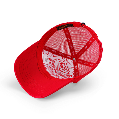 A classic snapback trucker hat by Von Dutch with stars&stripes embossed logo on front, red breathable mesh rear, and an adjustable snapback panel.?